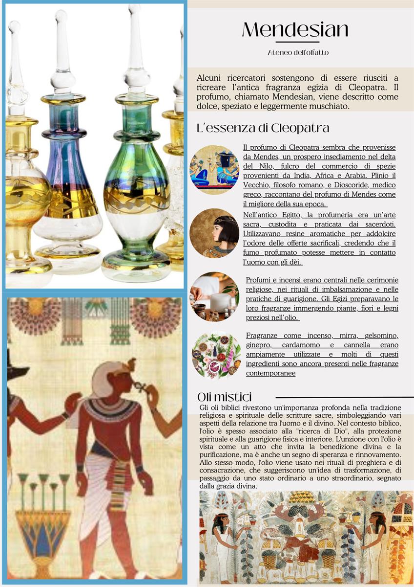 Il profumo di Cleopatra sembra che provenisse da Mendes, un prospero insediamento nel delta del Nilo fulcro del commercio di spezie provenienti da India, Africa, e Arabia. Plinio il vecchio, filosofo romano e Dioscoride, medico greco, raccontarono del profumo di Mendes come il migliore della sua epoca.